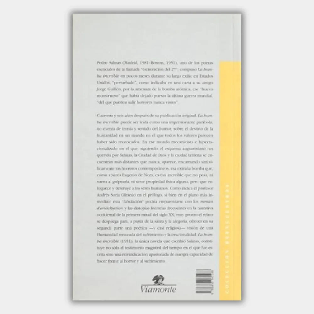Pedro Salinas (Madrid, 1891 - Boston, 1951) fue un poeta, ensayista y crítico literario español, considerado una de las figuras clave de la Generación del 27. Es célebre por su poesía amorosa, especialmente por su trilogía La voz a ti debida. Tras el estallido de la Guerra Civil Española, se exilió en Estados Unidos, donde ejerció como profesor universitario. La bomba increíble es su única novela, escrita durante su exilio y reflejo de sus profundas convicciones pacifistas en una era marcada por la guerra.