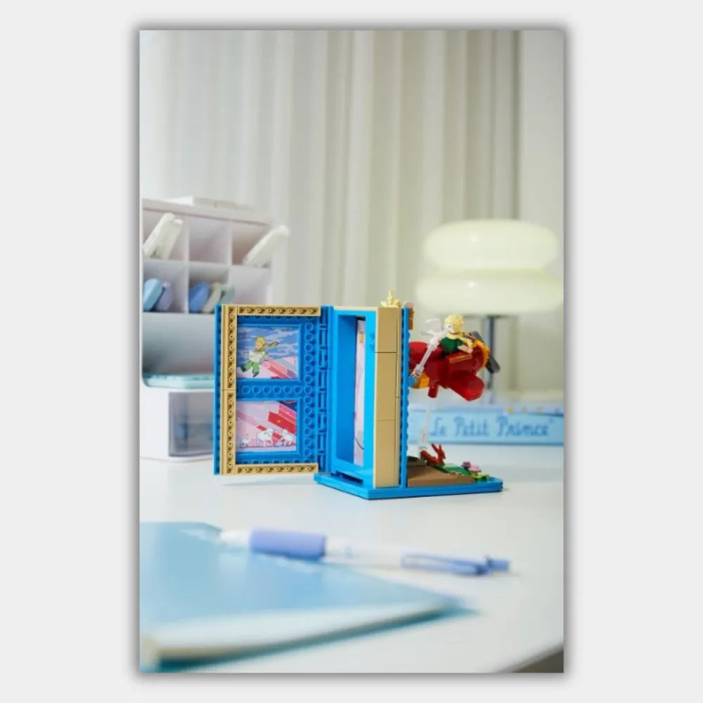 Este sujetalibros es un homenaje maravilloso a uno de los libros más queridos de la historia. Es un kit de construcción que te permite recrear con bloques una de las escenas más icónicas: El Principito, subido a su avión rojo, sobrevolando el desierto donde le espera su amigo el zorro.